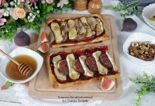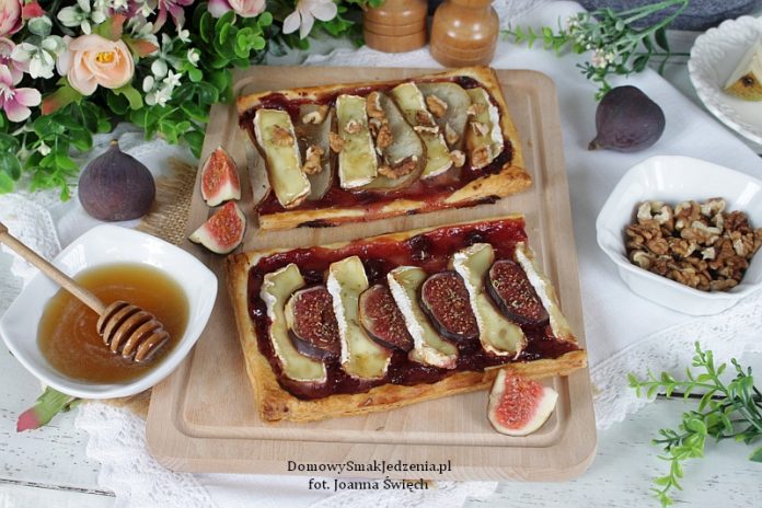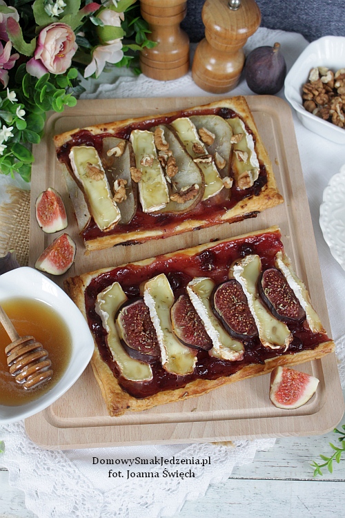 Ciasto francuskie rozwijamy, przecinamy na dwa równe kawałki i przekładamy na dużą blachę. Każdą część ciasta smarujemy konfiturą żurawinową. Figi, gruszkę i ser kroimy w plasterki. Na jednym cieście układamy na przemiennie plastry sera i plastry fig a na drugim cieście układamy naprzemiennie plastry sera i plastry gruszki. Brzegi ciasta smarujemy rozkłóconym jajkiem i całość posypujemy rozmarynem. Pieczemy w 200 st. C przez ok. 15 – 25 min., aż ciasto się zrumieni. Przed podaniem możemy posypać uprażonymi orzechami włoskimi i polać miodem.