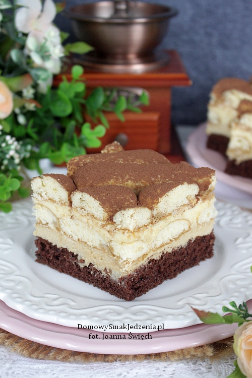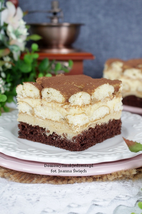 Biszkopt opcjonalnie smarujemy dżemem z czarnej porzeczki a następnie rozsmarowujemy krem z czekoladą. Układamy biszkopty delikatnie maczane w naparze kawy i wykładamy krem z kawą na którym układamy po skosie biszkopty delikatnie maczane w naparze kawowym. Całość odstawiamy najlepiej na noc aby ciasto się ustabilizowało. Przez podaniem całość oprószamy kakao.