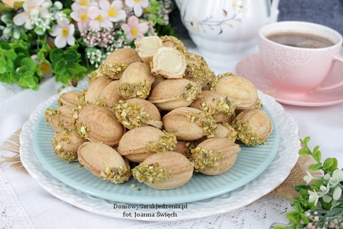 Śmietankę kremówkę doprowadzamy do zagotowania (ale nie gotujemy). Gorącą kremówkę wlewamy do połamanej czekolady, odstawiamy na ok. 1 min. a następnie dokładnie mieszamy, aż czekolada się rozpuści. Dodajemy mleko w proszku i miksujemy do połączenia się. Masę odstawiamy do wystudzenia a a następnie schładzamy przez ok. 2-3 godz. Do schłodzonej masy dodajemy krem pistacjowy (kremu pistacjowego dodajemy wg własnego smaku) i miksujemy ok. 2 min. Gotowym kremem nadziewamy połówki orzeszków i sklejamy. Dodatkowo orzeszki możemy udekorować roztopioną czekoladą i drobno posiekanymi pistacjami.