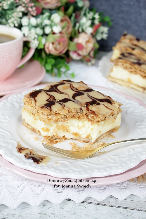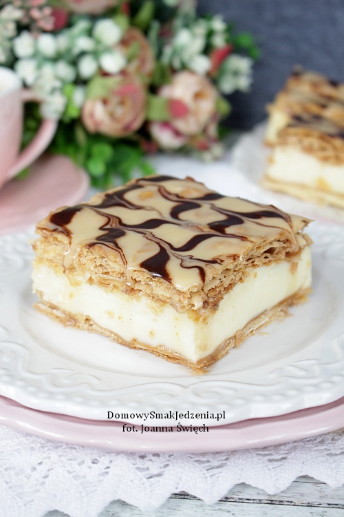 700 ml mleka zagotowujemy z cukrem oraz masłem. W pozostałym mleku dokładnie mieszamy budynie i wlewamy do gotującego się mleka. Gotujemy cały czas mieszając, aż powstanie gęsty budyń. Zestawiamy z ognia odstawiamy na chwilę a następnie miksujemy i wlewamy powoli ajerkoniak. Gorącą masę wykładamy na pierwszy upieczony blat i przykrywamy drugim, lekko dociskamy. Całość odstawiamy do wystudzenia. Wierzch dowolnie dekorujemy cukrem pudrem lub lukrem ajerkoniakowym, który zrobiłam na oko 😉 tzn. do cukru pudru dodałam ajerkoniak a wzorek zrobiłam z tego samego lukru dodając kakao. Gotową napoleonkę odstawiamy najlepiej na noc.