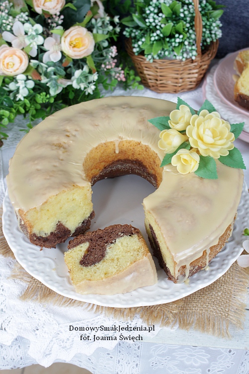 Jajka miksujemy z cukrem przez około 5–8 minut, aż uzyskamy jasną i puszystą masę. Następnie, cały czas miksując, powoli dodajemy olej. Dodajemy jogurt oraz ekstrakt lub skórkę i miksujemy krótko – tylko do połączenia składników. Dodajemy przesianą mąkę wymieszaną z proszkiem do pieczenia i ponownie miksujemy krótko, jedynie do uzyskania jednolitej konsystencji. Ciasto przelewamy do formy (tortownicy z kominem), wcześniej natłuszczonej i oprószonej bułką tartą. Niewielką część ciasta zostawiamy, dodajemy do niej kakao, dokładnie mieszamy i wylewamy na jasne ciasto. Pieczemy w temperaturze około 175°C do tzw. suchego patyczka, przez ok. 50–55 minut.