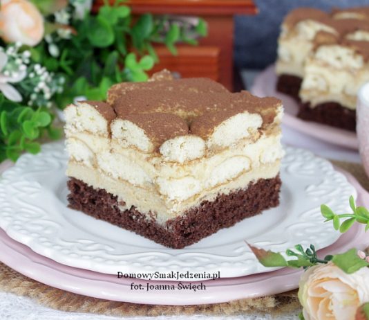 ciasto z kremem, nutą kawy i brzoskwiniami