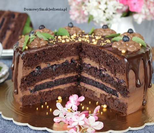 pyszne ciasto czekoladowo truskawkowe z kremem i bezikami