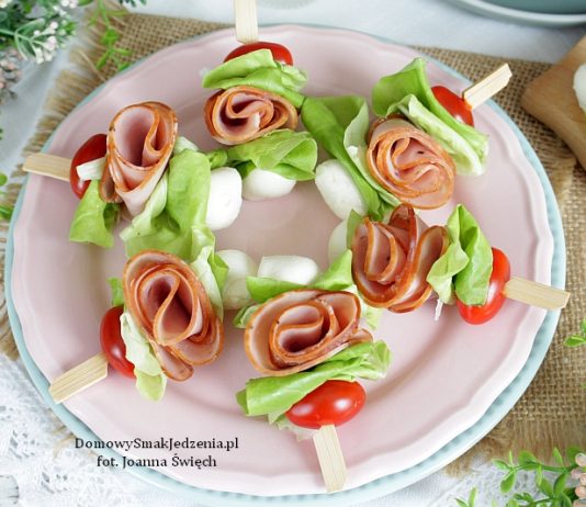 koreczki imprezowe z kiełbasą, pomidorkami, mini mozzarellą oraz sałatą